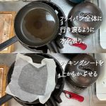 フライパン全体に行きわたるぐらい水を入れ、上からクッキングシートを敷く。
