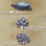 アジは骨と皮をとって、みじん切り(なめろう)にする。