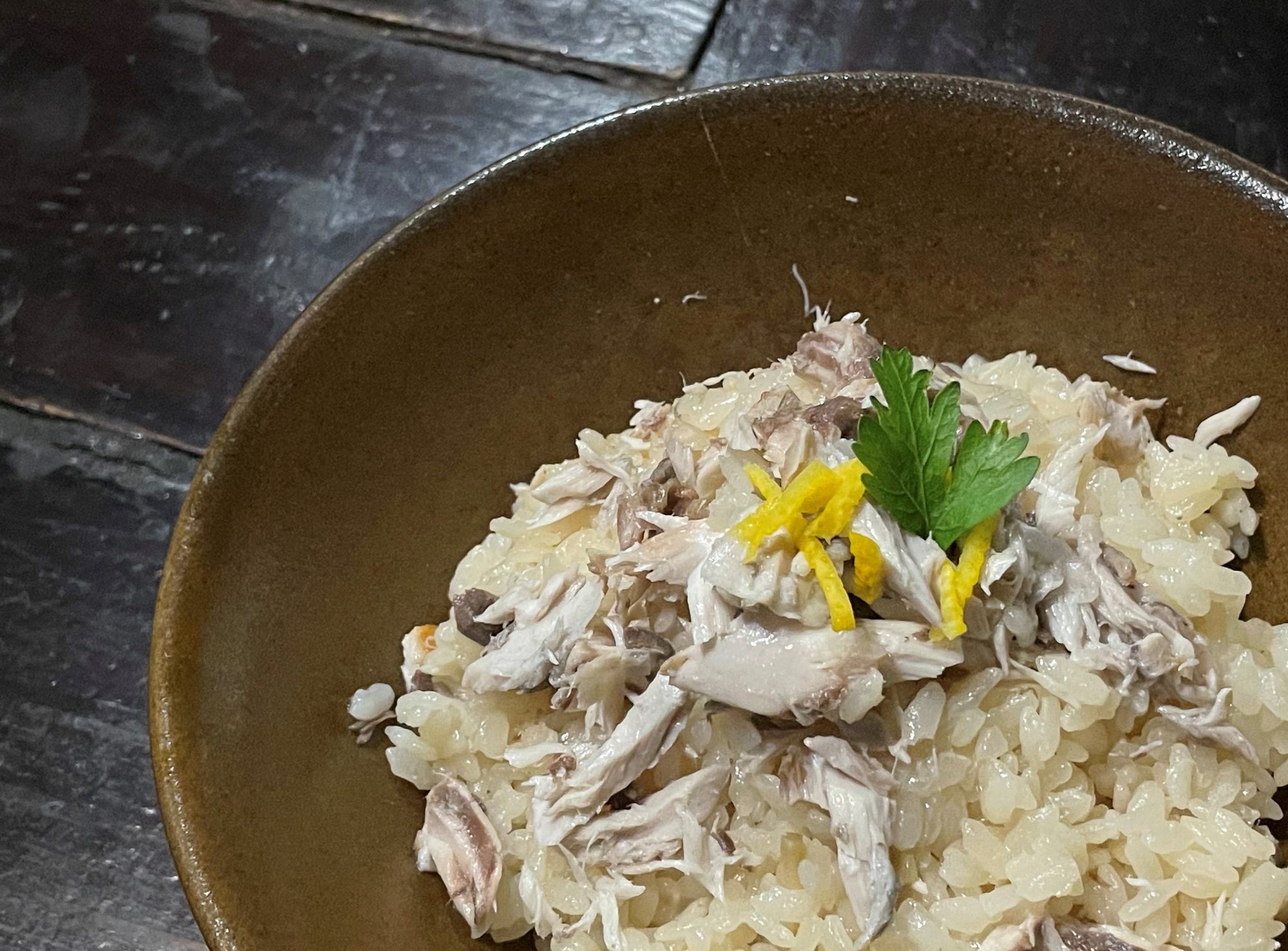 炊きあがったご飯にほぐしたサバを混ぜ込み、器に盛ってすだち/ゆずを絞る。